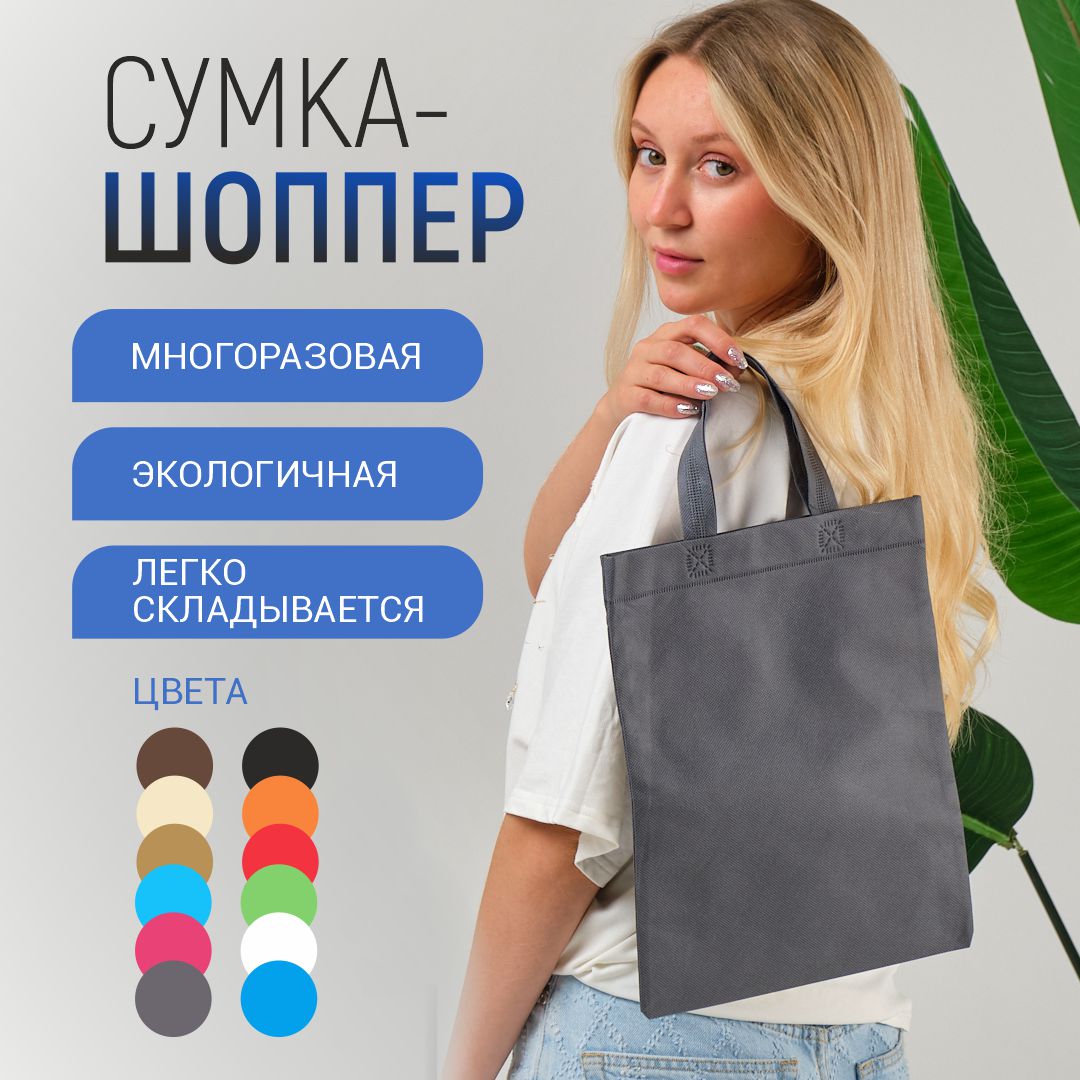 Многоразовый шоппер из нетканого материала с надежными пришивными ручками. Сумка из спанбонда приятная на ощупь, легкая и компактная.