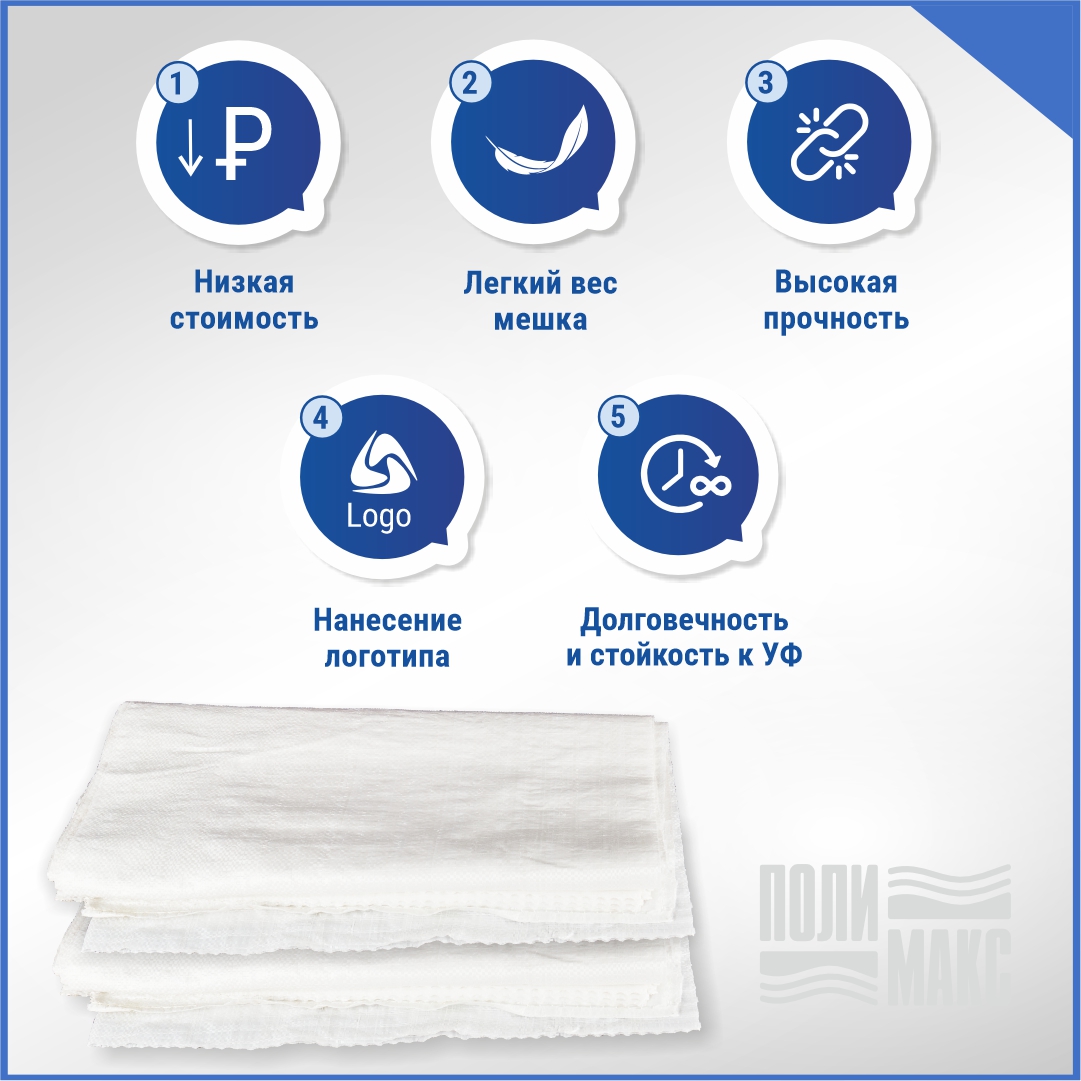 Компания «Полимакс» предлагает белые мешки из первичного полиэтилена размером 56×107 см и вместимостью до 50 кг. Плотное плетение обеспечит сохранность содержимого. Ткань воздухопроницаема, поэтому пищевая продукция сохраняет свое качество. Посторонний запах отсутствует.
