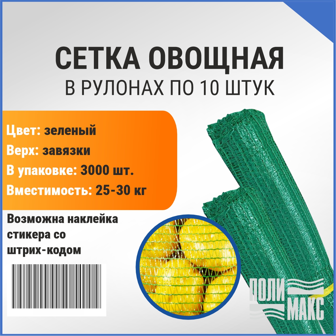 —Сетка овощная 30 кг, 45 х 75 см, зеленый, скрутки по 10 шт.